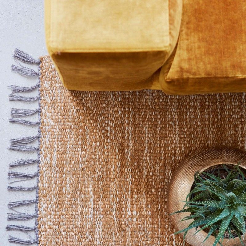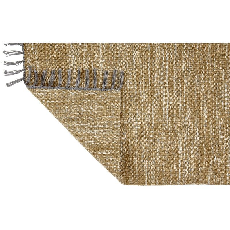 Alfombra de polietileno reciclado. Esta alfombra es perfecta para todo tipo de espacios, desde coloniales, escandinavos, nórdicos, boho chic etc. El tejido es perfecto para conseguir ese toque cómodo y mullido para ti y tu familia. Cuenta con un diseño sencillo en tono mostaza y natural con flecos. Quedará genial en todo tipo de estancias y su agradable acabado ofrece una pisada suave. Es un modelo que podrás introducir en dormitorios, salones, baños, cocinas, recibidores. Encajará a la perfección con multitud de colores y materiales. Conseguirás un rincón único y confortable y evitarás resbalones en casa.