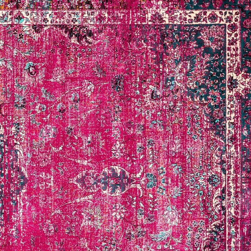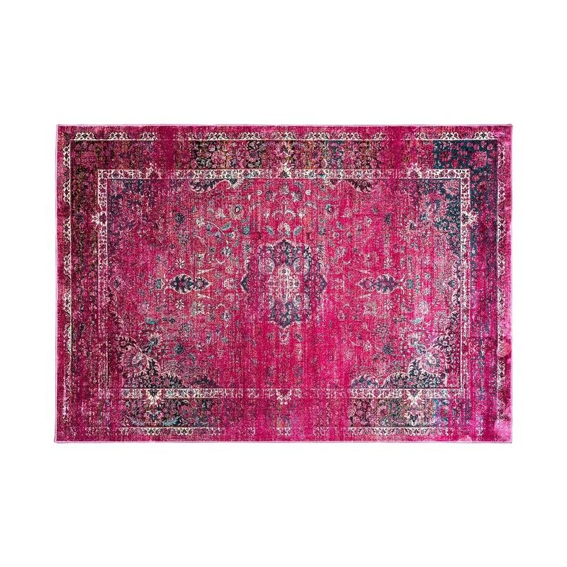 Alfombra kepa, en color rosa ribeteado, de estilo clásico. fabricado en viscosa.