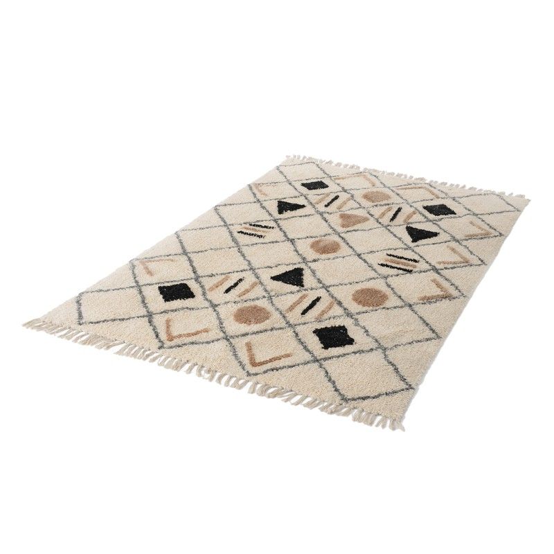 Alfombra Ryokan fabricada con algodón 80% y poliéster 20%. Tiene un diseño étnico muy original con figuras geométricas en tonos tierra y negro sobre un fondo beige. Aporta calidez y estilo en la estancia con esta alfombra que aportará personalidad y comodidad en la pisada. Tiene flecos en los dos extremos en color beige. Podrás colocar esta alfombra a los pies de la cama, en el salón o en un pasillo alargado. Gracias a los materiales con los que está fabricado su limpieza y mantenimiento es muy sencillo y se puede lavar fácilmente.