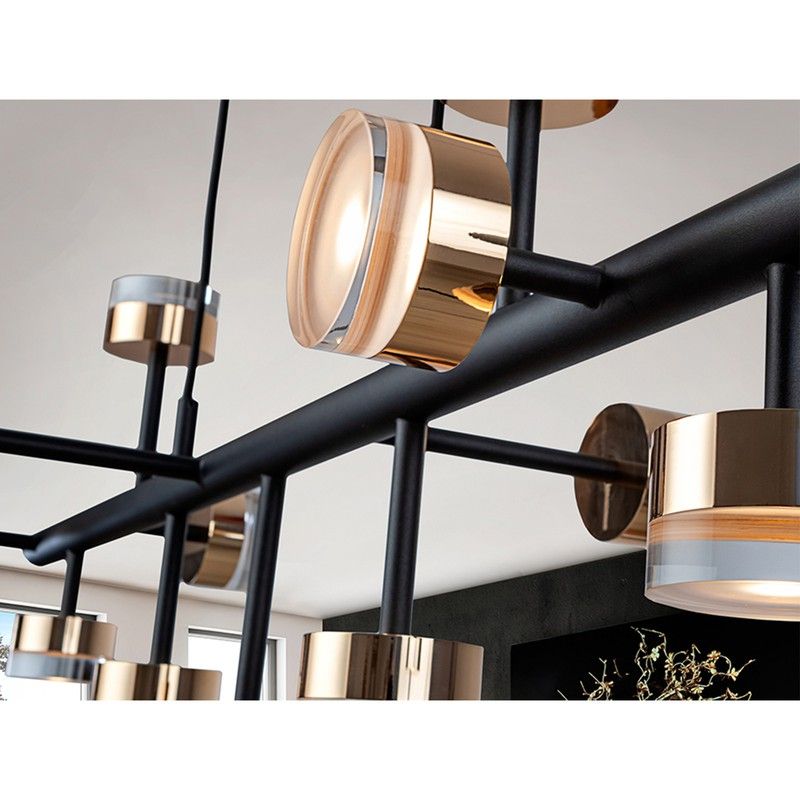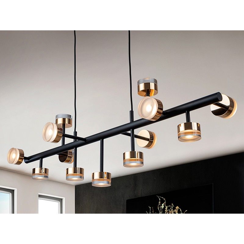Elegante lámpara de techo con 13 luces LED con altura regulable. Está fabricada con metal con acabado negro mate. Sus 13 luces LED cuentan con tulipa cilíndricas con base de metal dorado y un difusor de acrílico transparente. Tiene un diseño original con materiales de calidad que aportarán un toque chic. La particularidad de esta lámpara es que podrás regular la altura en función de tus necesidades. Podrás introducirla en espacios clásicos, modernos o contemporáneo.
