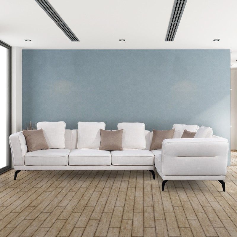 Si buscas una solución de esquina, este gran sofá con cojines mullidos en tono blanco roto pondrá la nota de elegancia y te ofrecerá el relax absoluto.