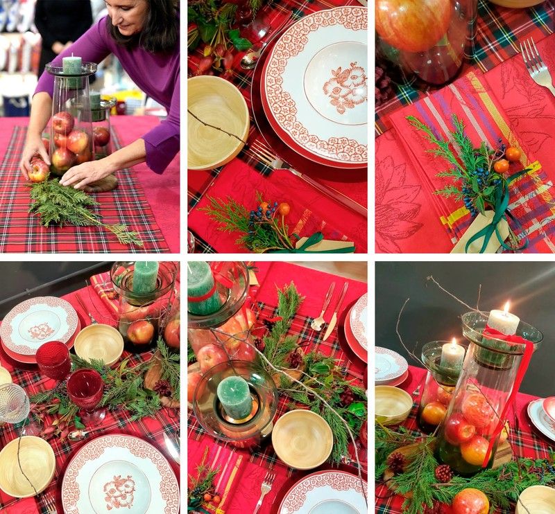 Tan solo necesitas un mantel rojo sobre el que colocar un camino de mesa escocés, tan característico de estas fechas navideñas. A continuación, y sobre el centro de mesa coloca un jarrón transparente a ser posible con colores parecidos a los del camino de mesa. Introduce en el jarrón manzanas rojas y el resultado es espectacular. Es un truco muy fácil pero con un efecto Wow! Acompaña el jarrón con elementos naturales como, por ejemplo, arizónica o escamujo, y completa el conjunto con alguna vela a juego.