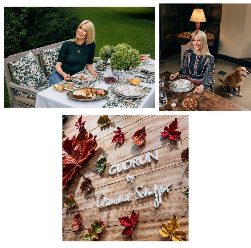 La nueva colección se llama "Gudrun" en homenaje a la madre de Claudia y está inspirada en los recuerdos infantiles y en las felices jornadas campestres compartidas en familia. Contiene motivos de inspiración otoñal, tales como; hojas de roble, ardillas, bellotas... y el estilo hace referencia a la estética mid-century, una de las favoritas de Claudia Schiffer.