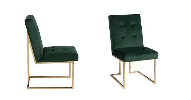 Si te apasiona el estilo art decó, Jolipa ha diseñado una colección de sillas de comedor con acabados cuidados y delicados como esta de terciopelo verde y estructura de metal dorado.
