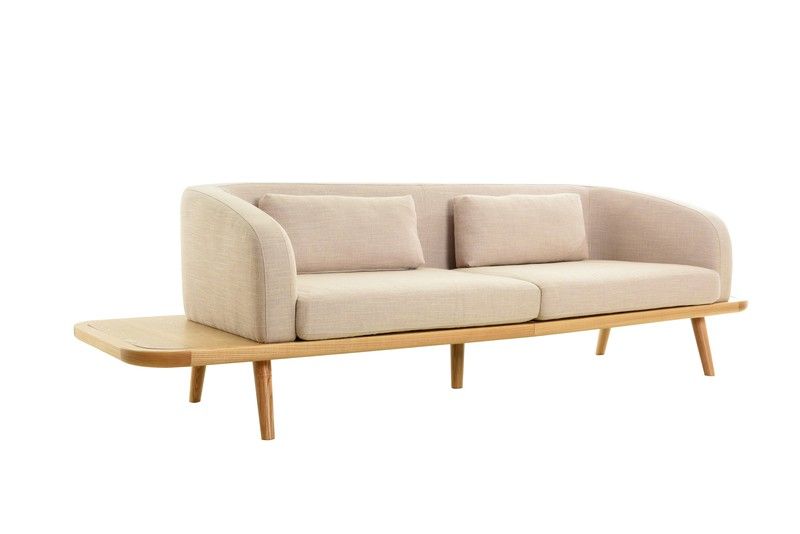 Uno de los productos estrella de esta colección es el sofá con estructura de madera de fresno y tapicería en un tono claro que encajará a la perfección con los muebles de su colección. Es un mueble que se caracteriza por la doble funcionalidad, además de conseguir un cómodo sofá en tu salón, incorpora una mesita gracias a la estructura de madera que lo sostiene. Con acabados rectos, mullidos cojines y reposabrazos, este sofá tiene todo lo necesario para tu salón.
