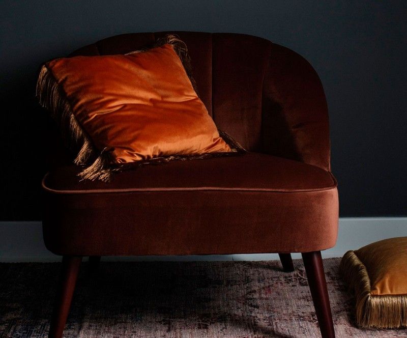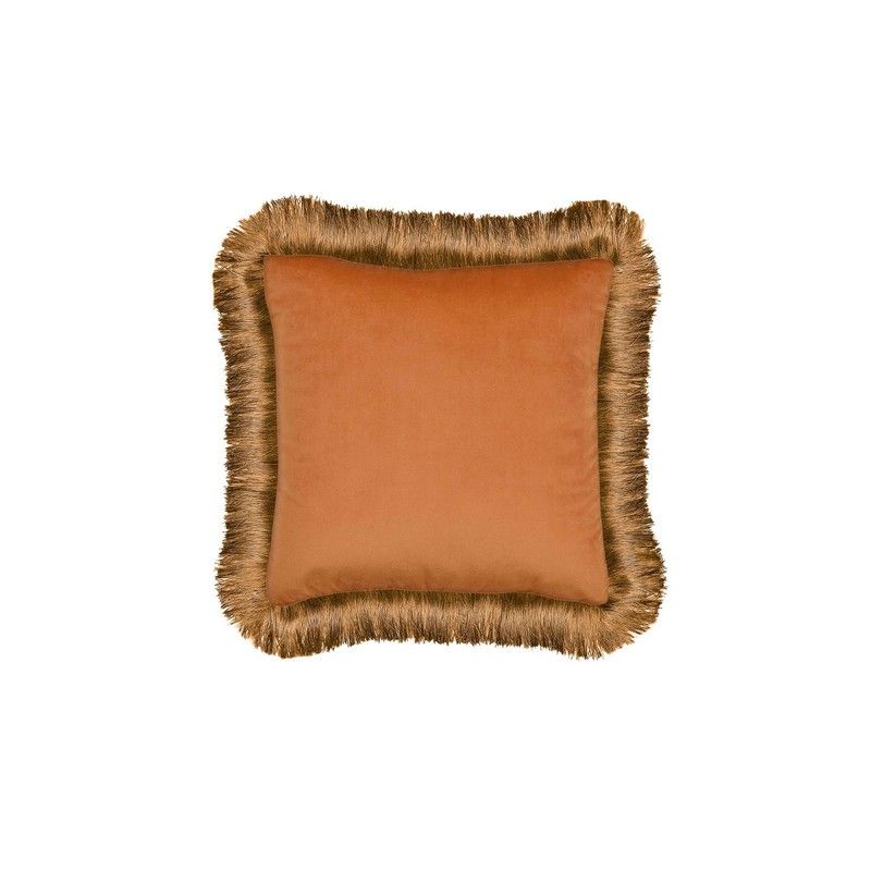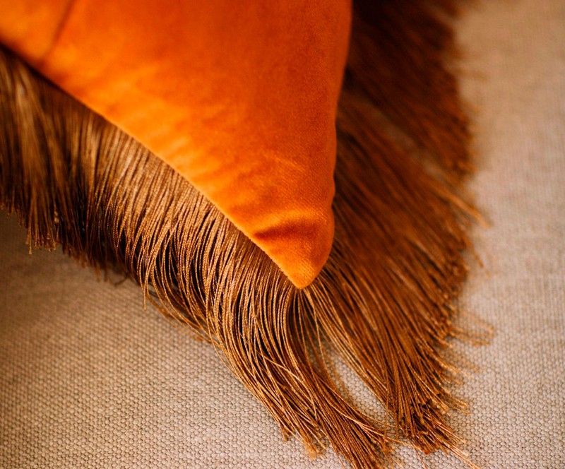 Cojín de terciopelo con flecos, color ámbar. Dimensiones 45 x 45 cm. Perteneciente a la línea de textiles y cojines para resaltar los espacios en el hogar. La suavidad del terciopelo resaltado con flecos en un cojín diseñado para el disfrute. Ideal para la decoración del salón o en el área del dormitorio.