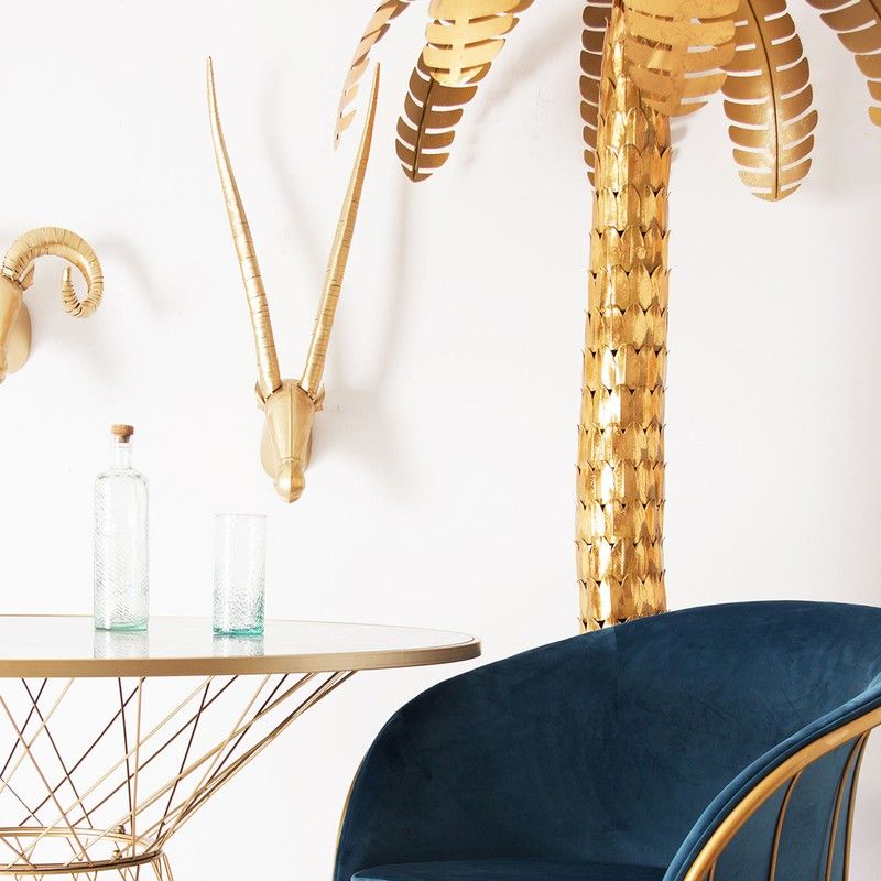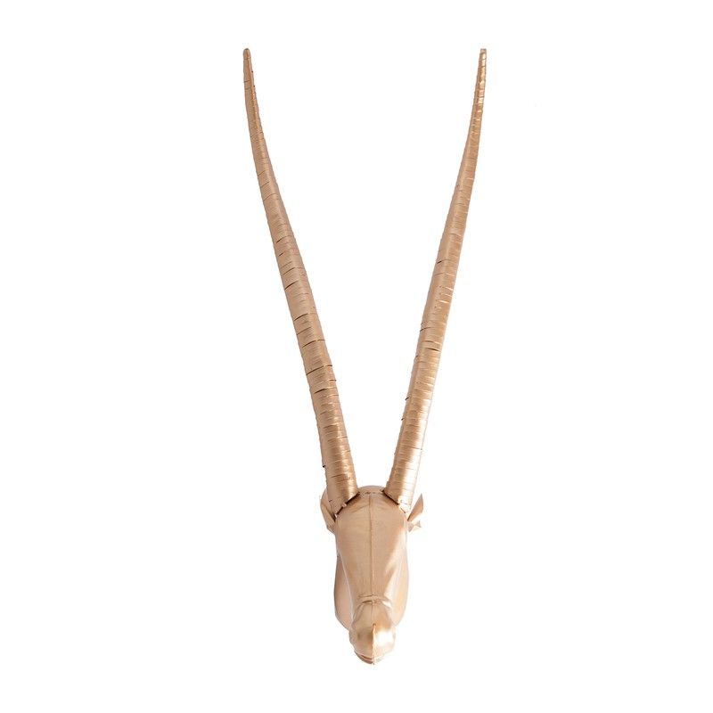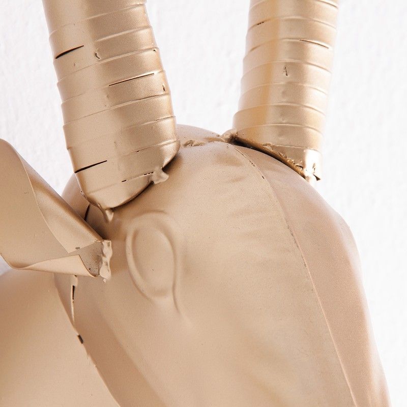 Figura de cabra montesa fabricada en hierro de color oro. Con un diseño muy original de cabeza de este elegante animal de grandes cuernos. Encaja a la perfección en estancias con estilos art deco, industriales, nórdicos, coloniales o contemporáneos. Podrás transformar una pared por completo solo con esta figura decorativa. Sobre el sofá, sobre la cama de matrimonio o en cualquier espacio al que quieras dar un toque diferente. ¡Coloca esta cabeza de cabra en tu hogar y sorprende a tus invitados!