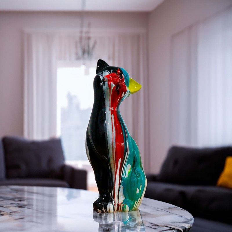 Figura de poliresina con diseño de gato de color negro y líneas desiguales de colores. Kuatéh reúne una elegante selección de piezas decorativas de diseño exclusivo y válidos para distintos estilos decorativos. Aporta un toque de color y alegría a tu hogar con este elemento decorativo. Puedes colocarlo en el suelo o sobre un aparador para conquistar todas las miradas.