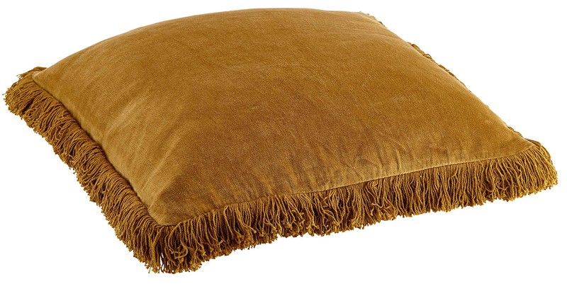 Funda de cojín fabricada con terciopelo y flecos en tono mostaza. Esta funda ofrece una agradable textura suave y es muy elegante, perfecta para la cama o el sofá. Solo tendrás que colocar un relleno de cojín del tamaño del relleno adecuado y vestir tu hogar con los textiles más elegantes. Podrás introducir el relleno de forma sencilla por el lateral. Tiene un tamaño de 45x45 cm para ofrecer un descanso cómodo y confortable para tu día a día. Apuesta por los materiales de alta calidad para ti y para los tuyos.