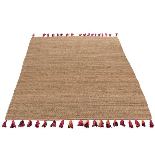 Alfombra de yute de grandes dimensiones con borlas decorativas. Esta alfombra es perfecta para espacios tropicales, coloniales, nórdicos y boho chic. El yute es una fibra natural perfecta para conseguir ese toque natural para estancias que sigan estos estilos. Cuenta con borlas decorativas en tono rosa en sus dos extremos para aportar un toque de color. Coloca esta alfombra en cualquier estancia, porche o terraza con puffs, cestas de mimbre y bonitas plantas con grandes hojas verdes. Conseguirás un rincón único en el que pasar agradables momentos con los tuyos.